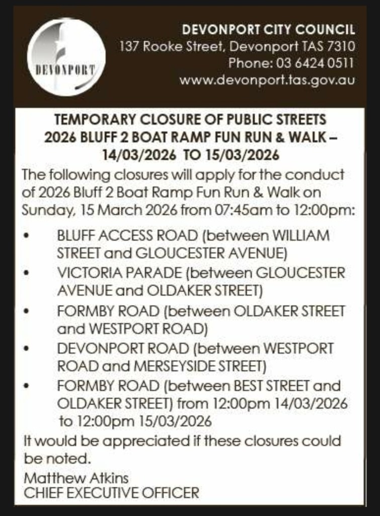 ROAD CLOSURES INFO ROAD CLOSURE LETTER BLUFF 2 BOAT RAMP 2026 FEB 17THDownload Updated 2nd of March, 2026 Advert in the Newspaper March 7th, 2026 ( Advocate)